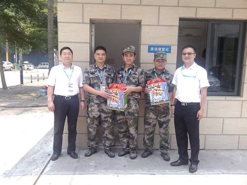 8月1日,正逢建軍節,集團副董事長兼總裁吳光勝、首席科學家黃永江來到公司門崗,看望慰問在崗的保安人員,并送上節日禮品?! 强倧娬{“華訊方舟的保安就是華訊方舟